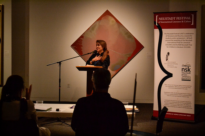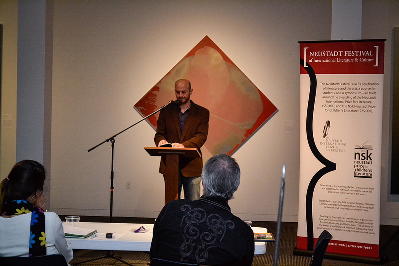 At opening night, the festival ignited with a celebration of poetry in all its forms. Two Norman high school students recited their favorite poems for our Poetry Out Loud competition, which sends students from across the country to compete in local, regional, and national poetry competitions. Ken Hada, Nathan Brown, and Ibtisam Barakat judged the competition, with WLT editor in chief Daniel Simon presiding as moderator.